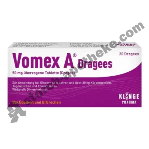 Vomex ist ein dimenhydrinathaltiges Antiemetikum zur symptomatischen Behandlung und Prophylaxe von Übelkeit, Erbrechen und Reisekrankheit.